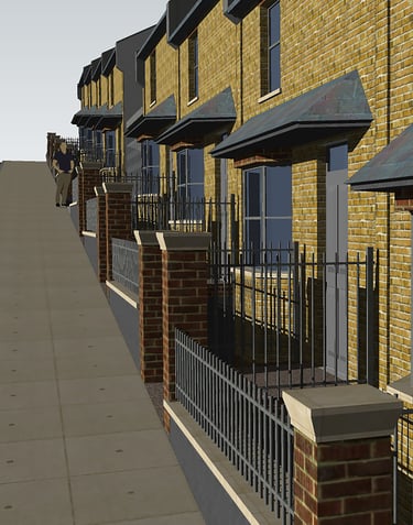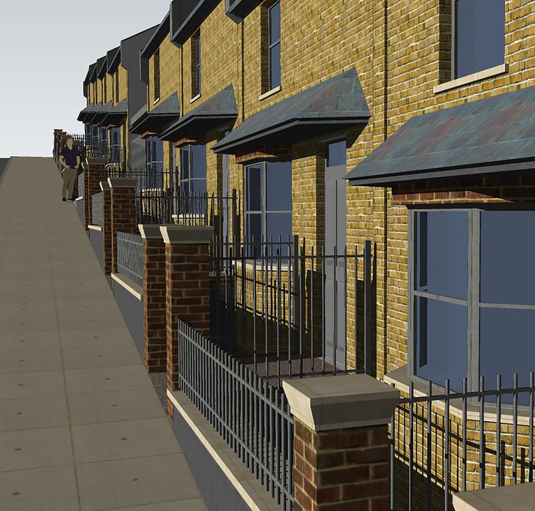 Seamlessly woven into the Victorian character of Sladedale Road, this development presents a unique architectural response to a steeply sloped site. The design maximises the terrain’s natural contours, offering west-facing rear gardens with sweeping panoramic views across the London skyline.